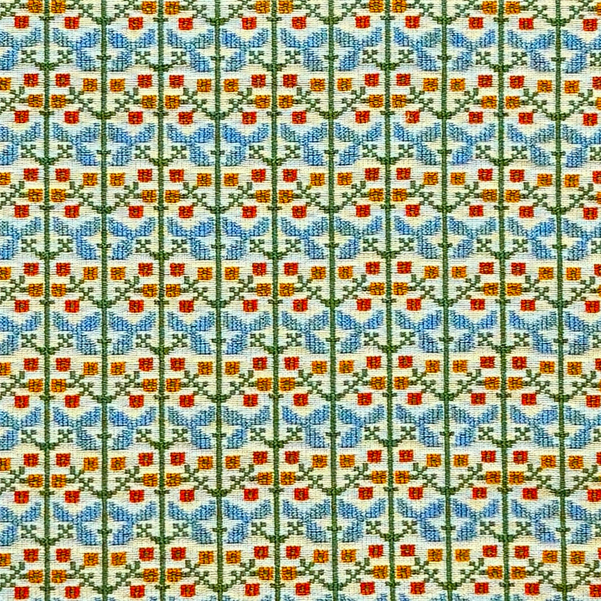 Patterned fabric with a gridded floral design in green, orange and blue.