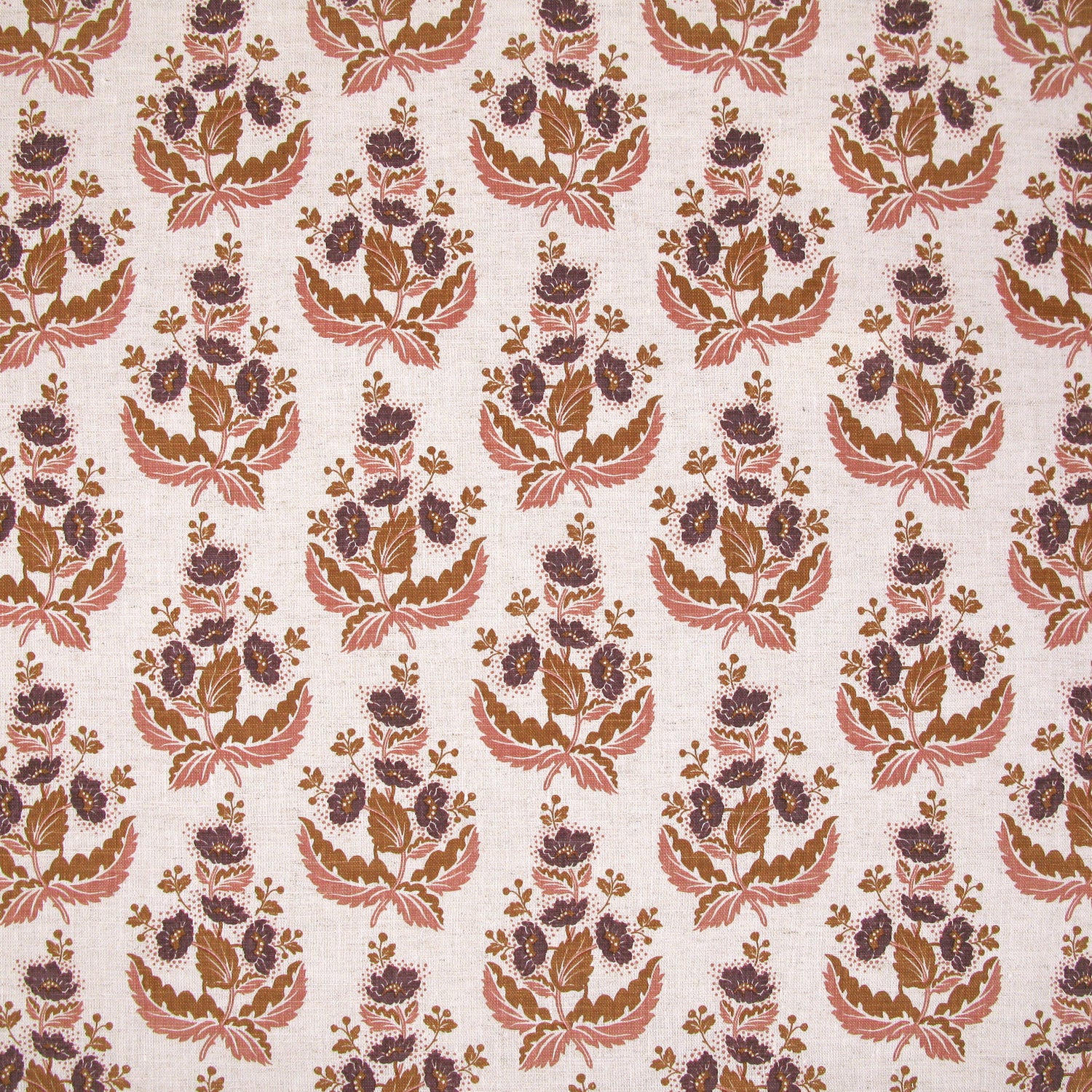 Patterned fabric with floral design in brown, pink and purple on a light background