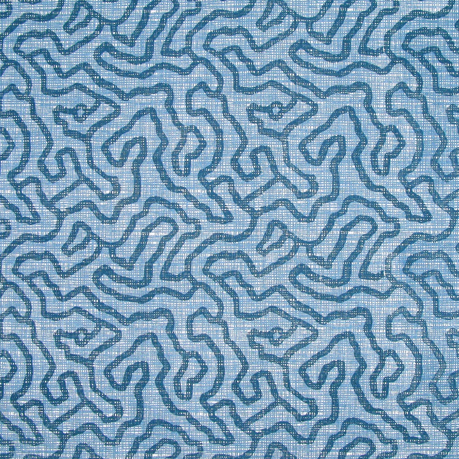 Printed fabric in a meandering hand drawn line pattern in blue on a light blue field.