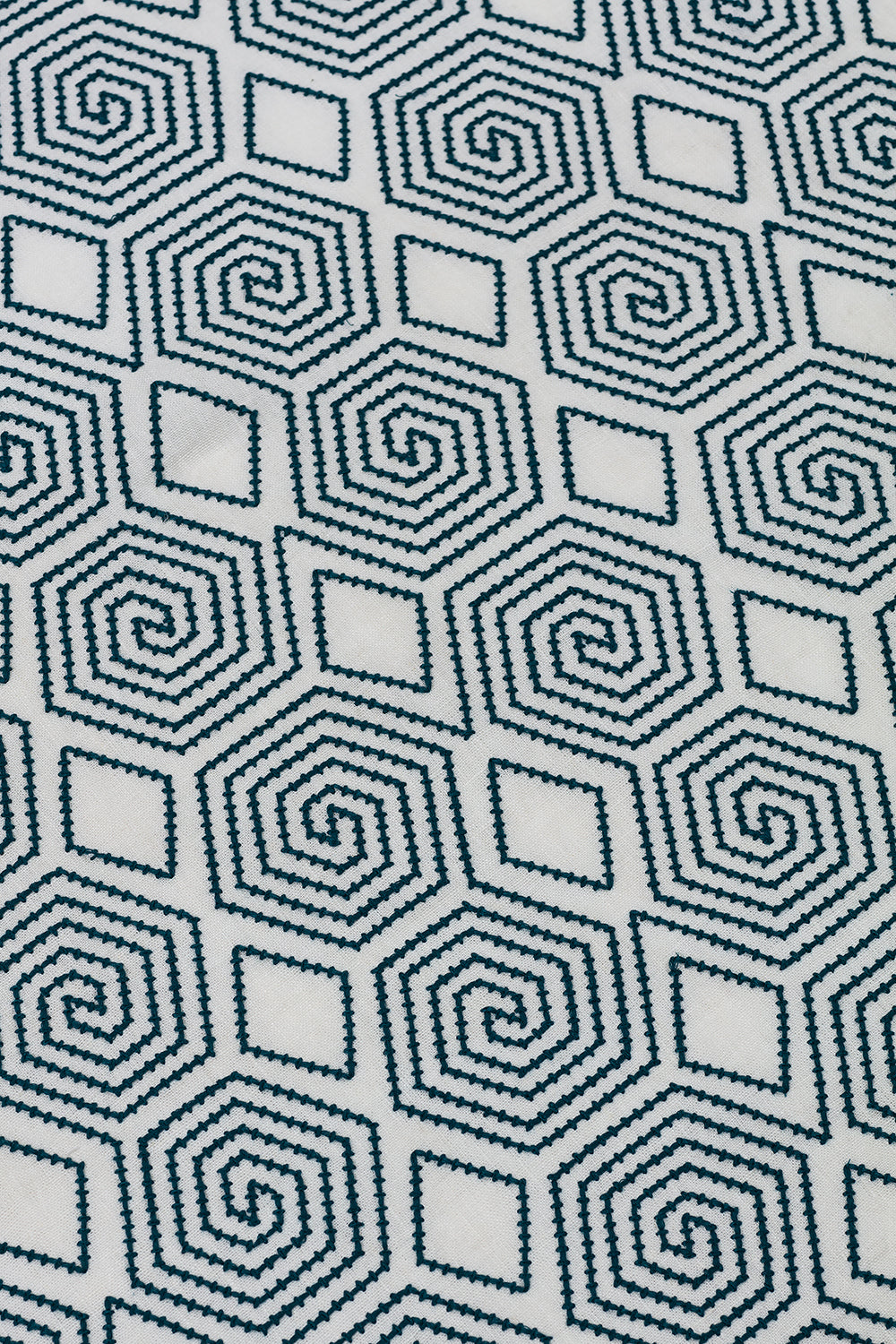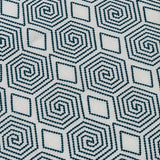 Embroidered fabric with a geometric spiral design in navy on a cream field.
