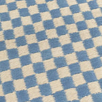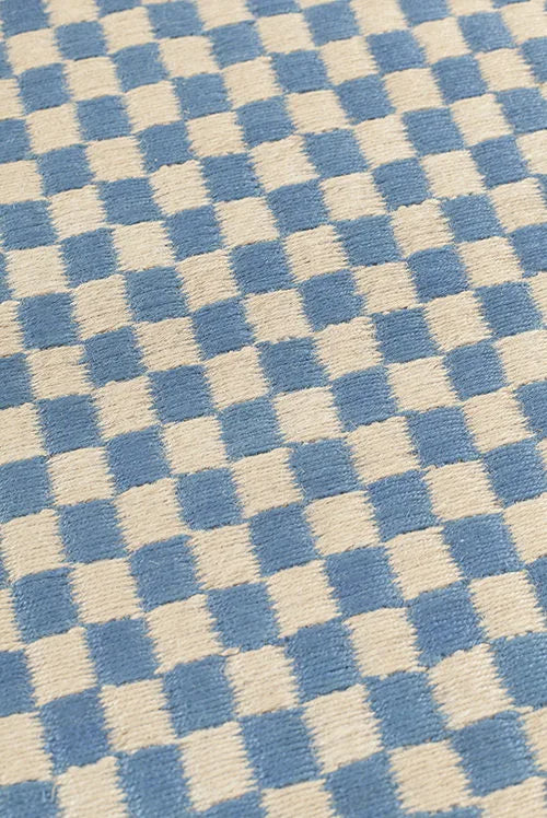 Checkered pattern rug with blue and white squares