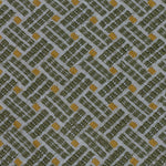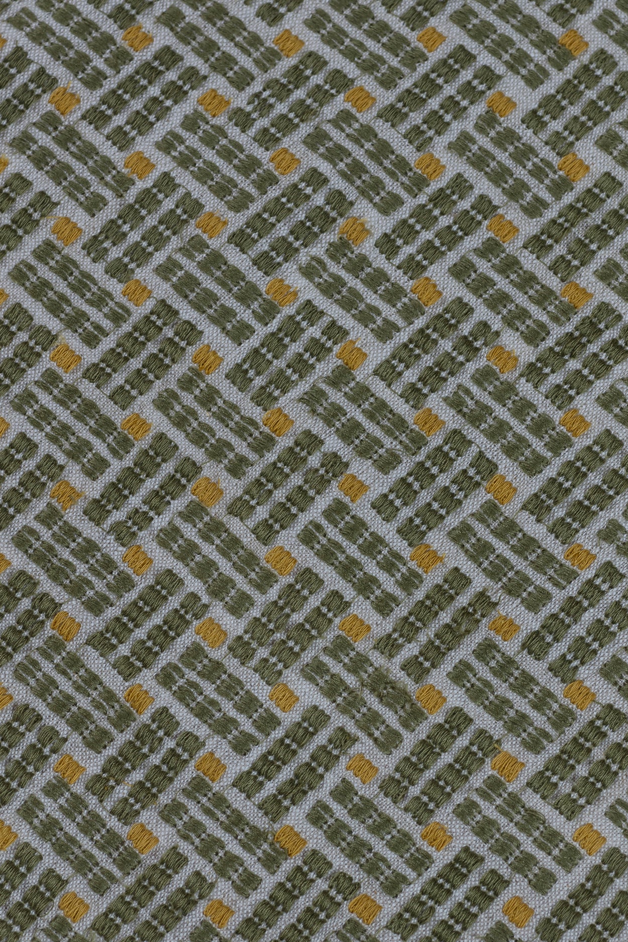 Embroidered fabric in a dashed basketweave design in sage green with yellow accents.