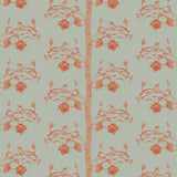 Detail of wallpaper in a linear tree and leaf print in burnt orange on a light green field.