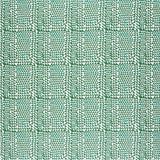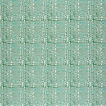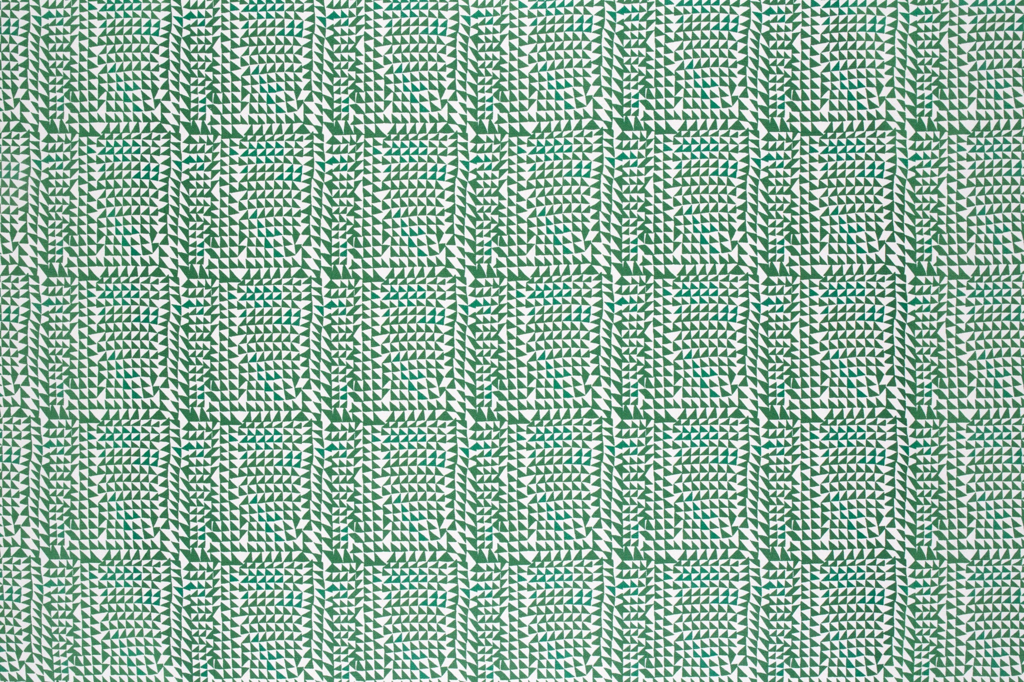 Detail of fabric in a dense triangle grid print in green on a white field.