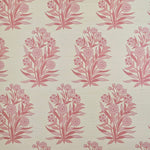Detail of fabric in a repeating floral print in shades of pink and coral on a cream field.