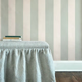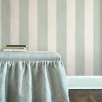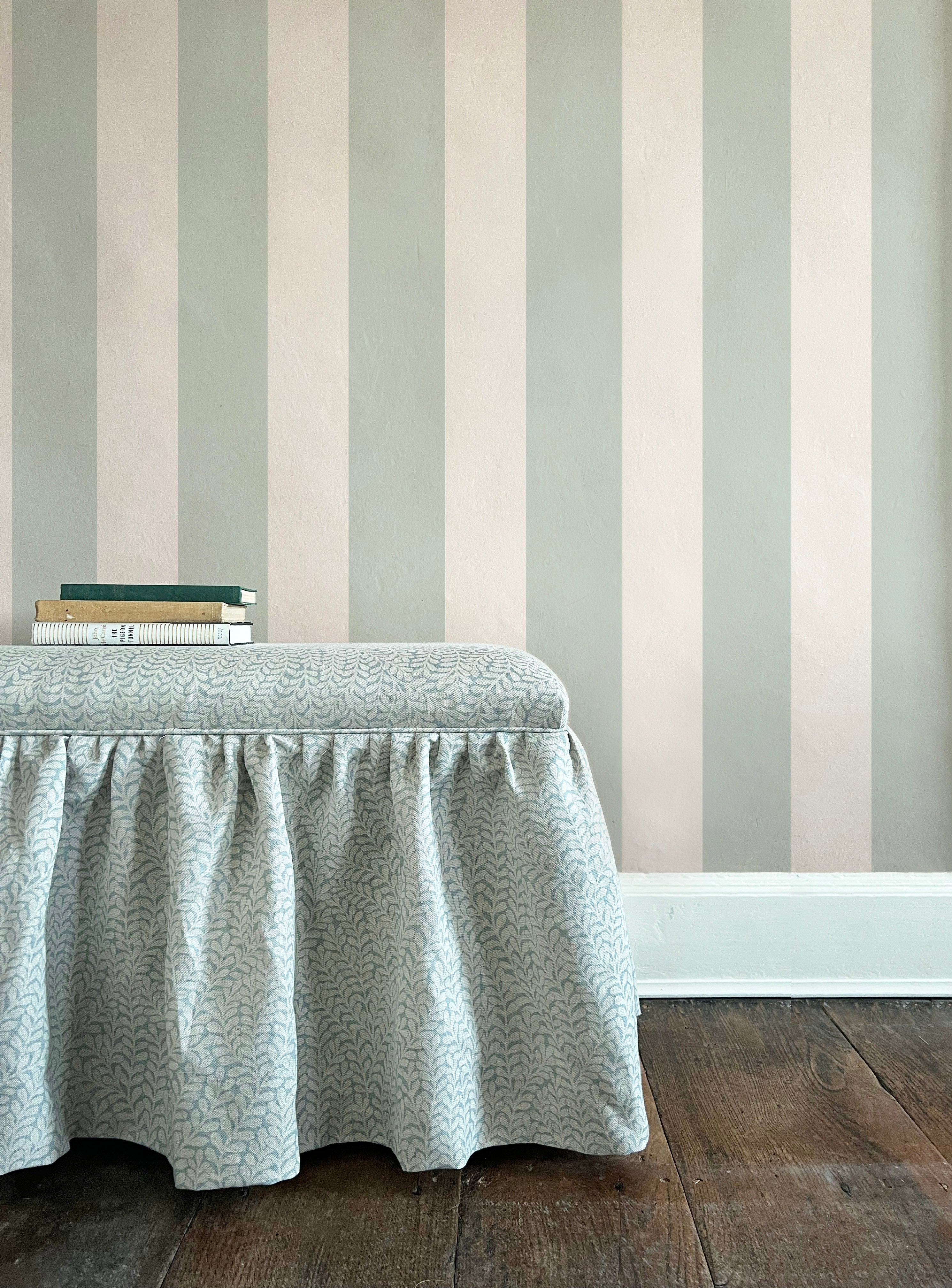 An upholstered ottoman topped with a stack of books stands in front of a wall papered in a wide stripe print.