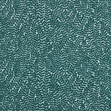 Detail of fabric in a scrolling stem and leaf print in dark turquoise on a white field.