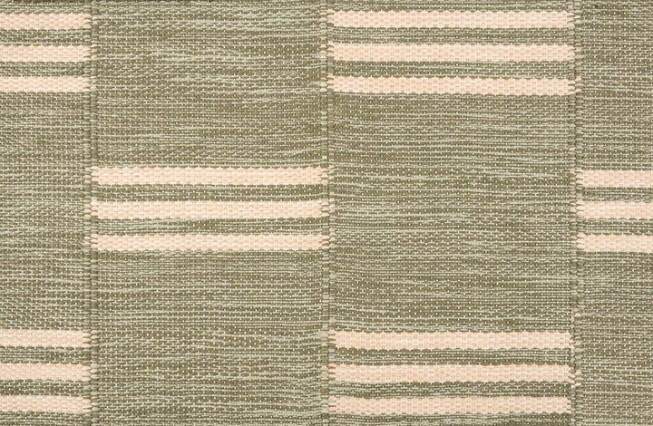 Broadloom flatweave carpet in a broken stripe in white on a sage green field.