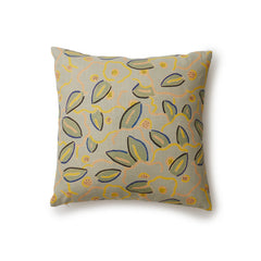 A square throw pillow in a large-scale minimal floral print in shades of yellow, peach and green on a light blue background.