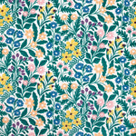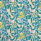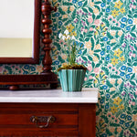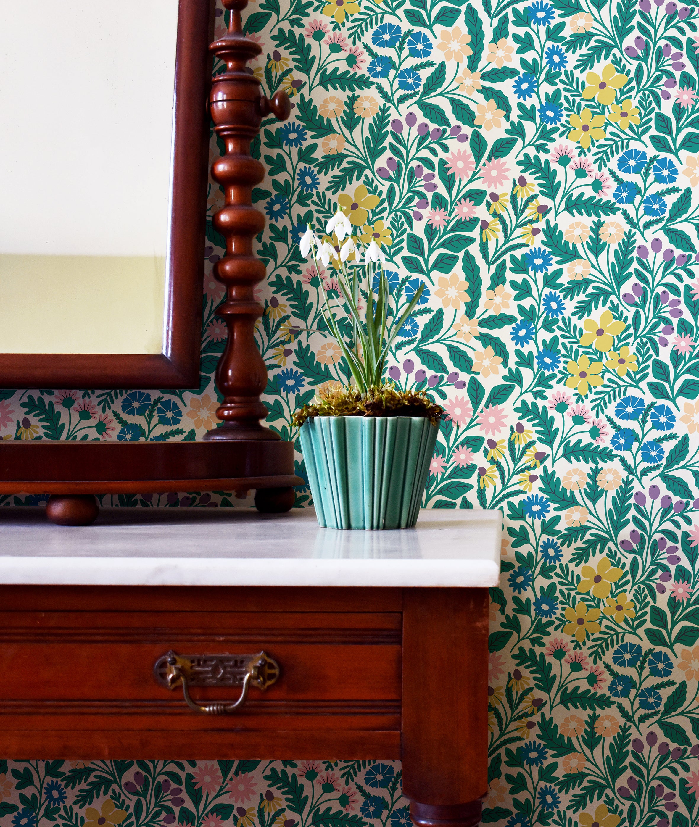 Detail of wallpaper in a small-scale floral print in green, yellow and coral on a white field.