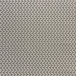 Detail of fabric in a playful curving stripe in cream on a gray field.