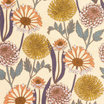 Detail of fabric in a large-scale floral print in yellow, orange and green on a yellow field.