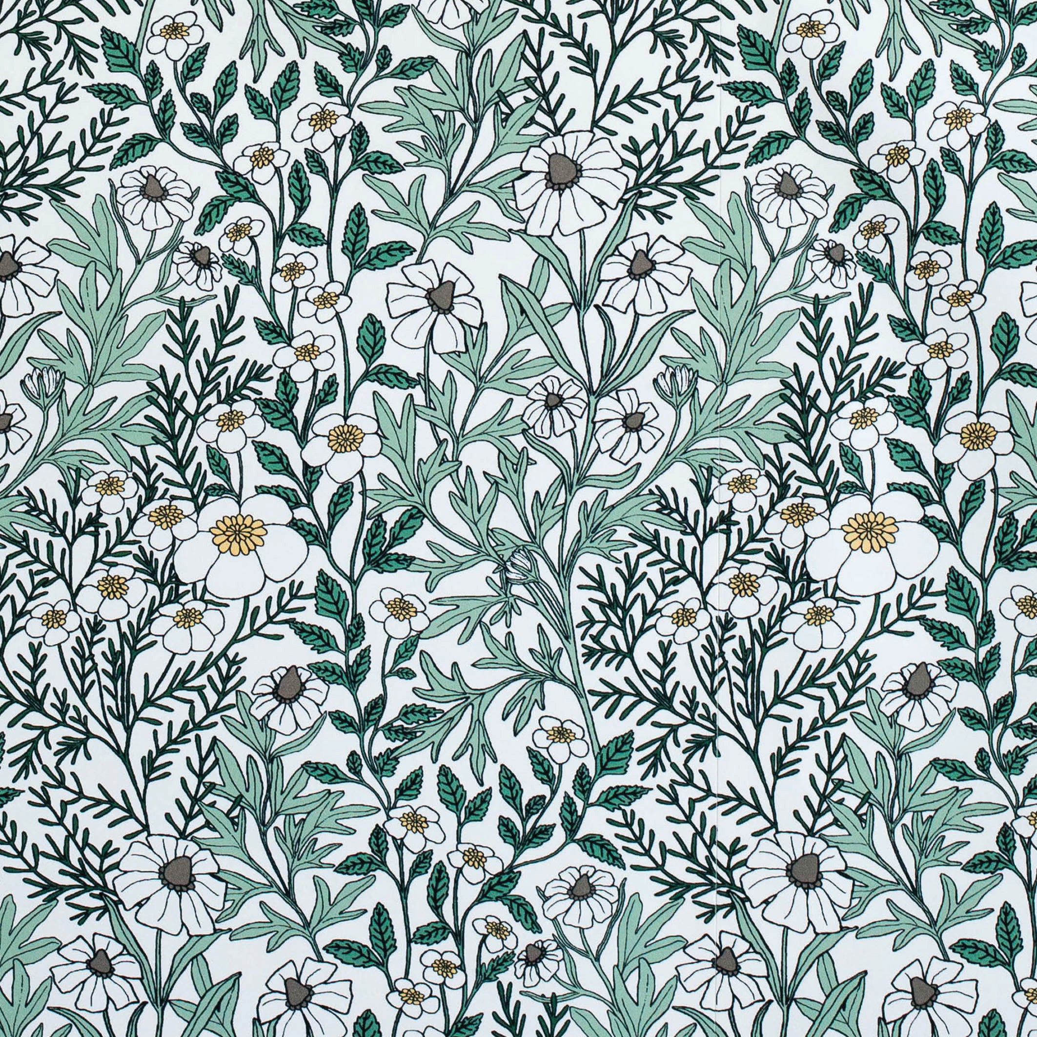 Detail of wallpaper in a dense floral print in white, tan and green on a white field.