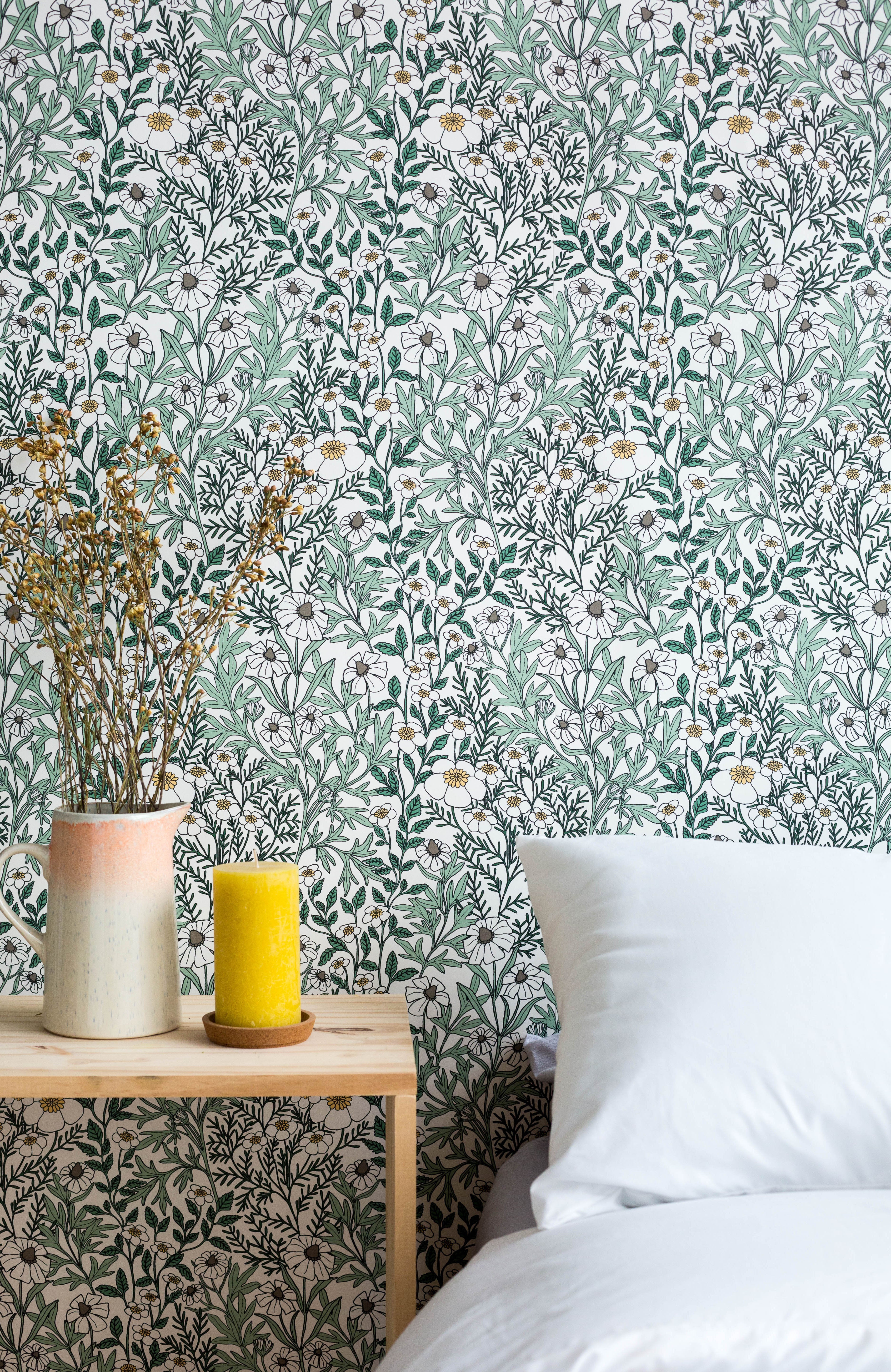 A bed and vase of flowers stands in front of a wall papered in a dense floral print in white, tan and green on a white field.
