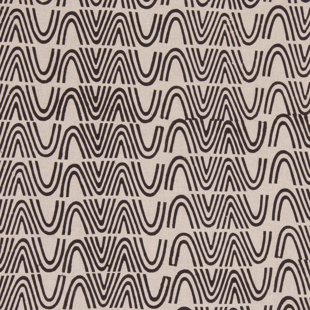 Detail of fabric in an abstract curvilinear stripe in black on a tan field.