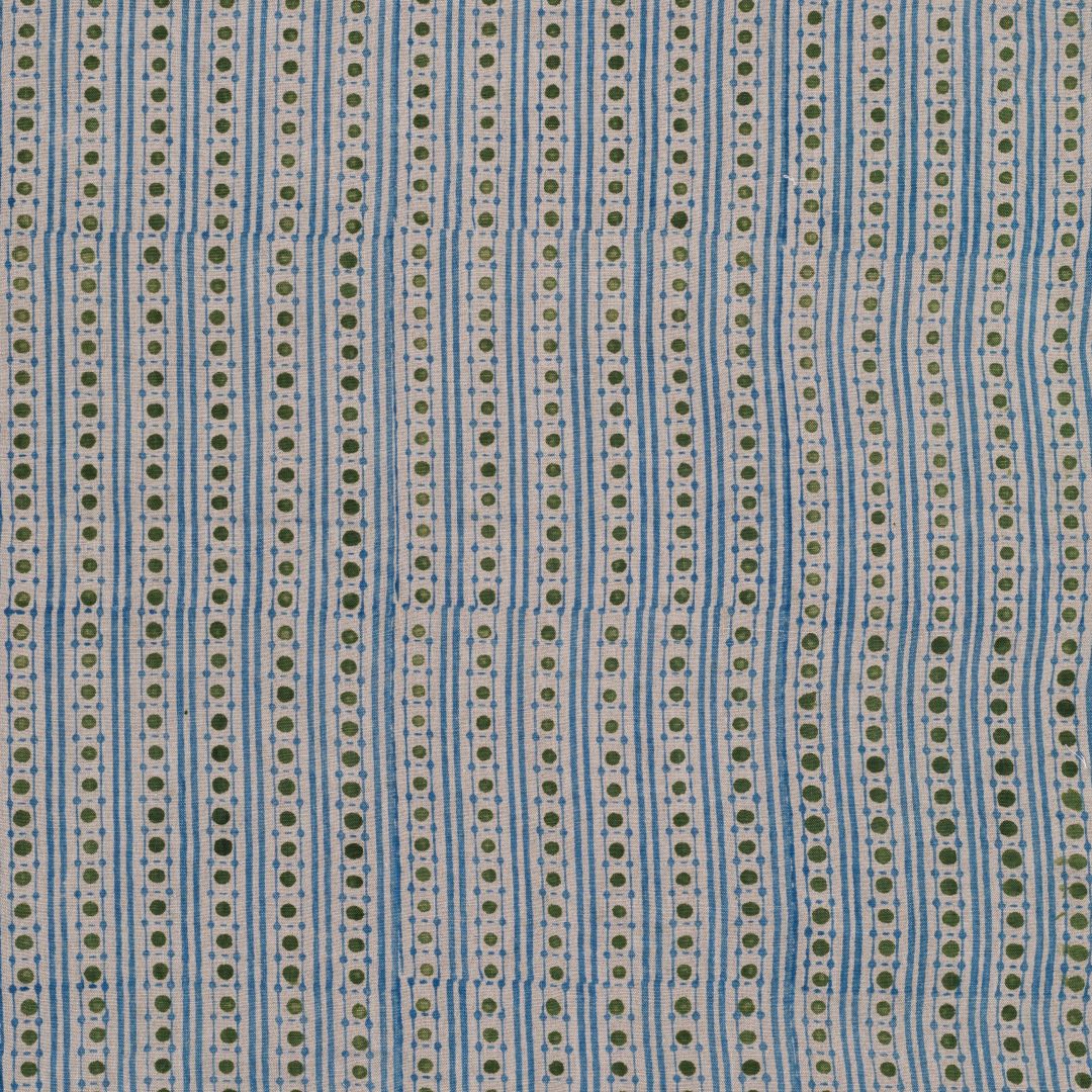 Detail of fabric in a geometric striped print in green and blue on a tan field.
