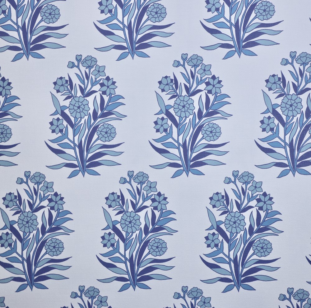 Detail of fabric in a repeating floral print in shades of blue and navy on a light blue field.