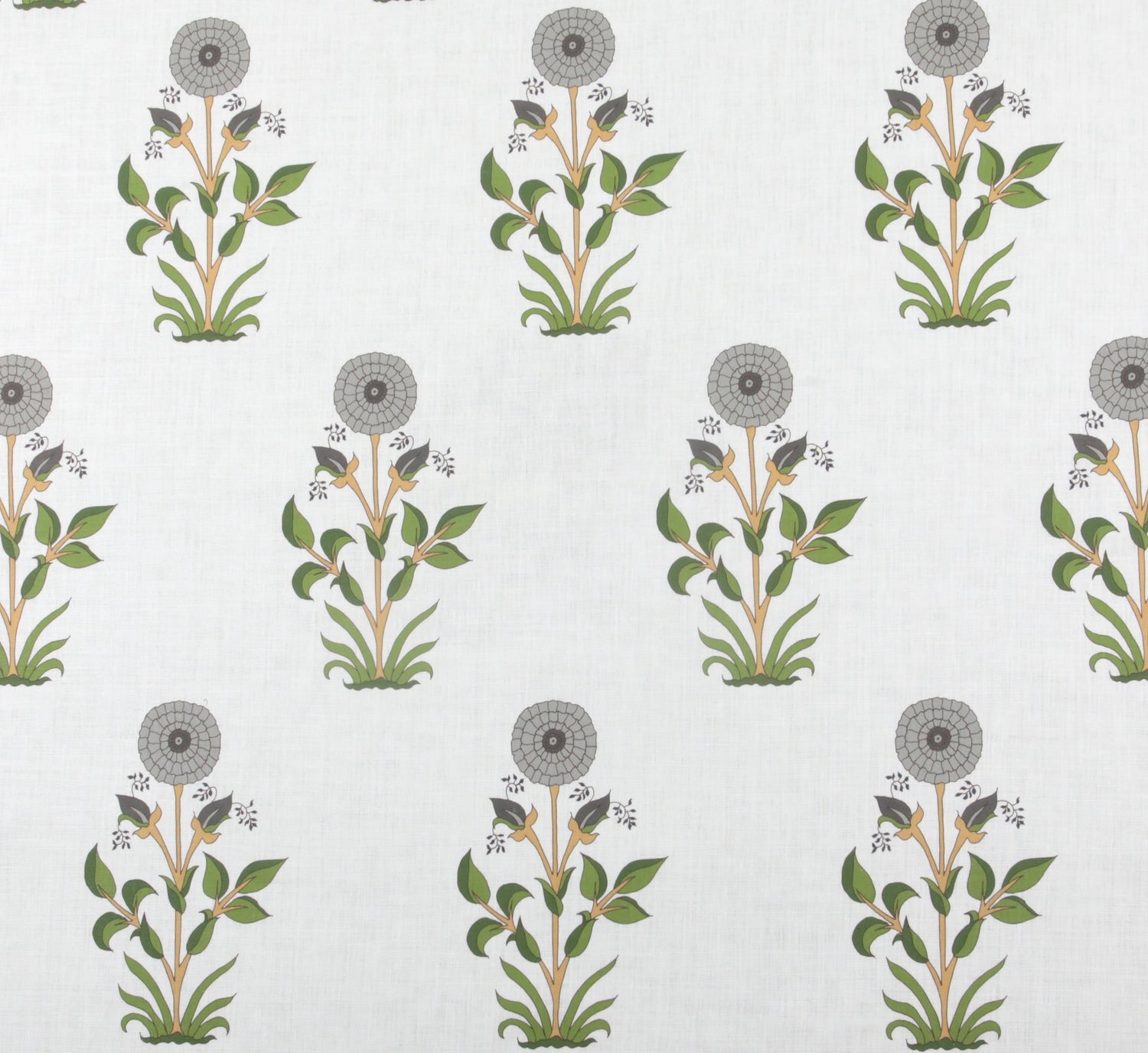 Detail of fabric in a large-scale marigold print in gray, orange and green on a cream field.