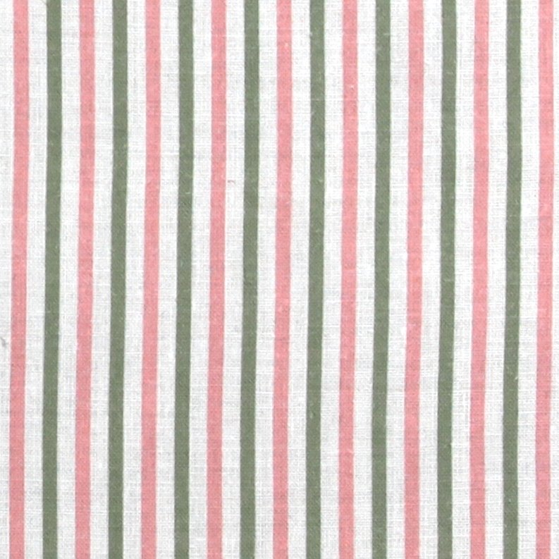 Detail of fabric in a small-scale stripe print in sage and pink on a white field.