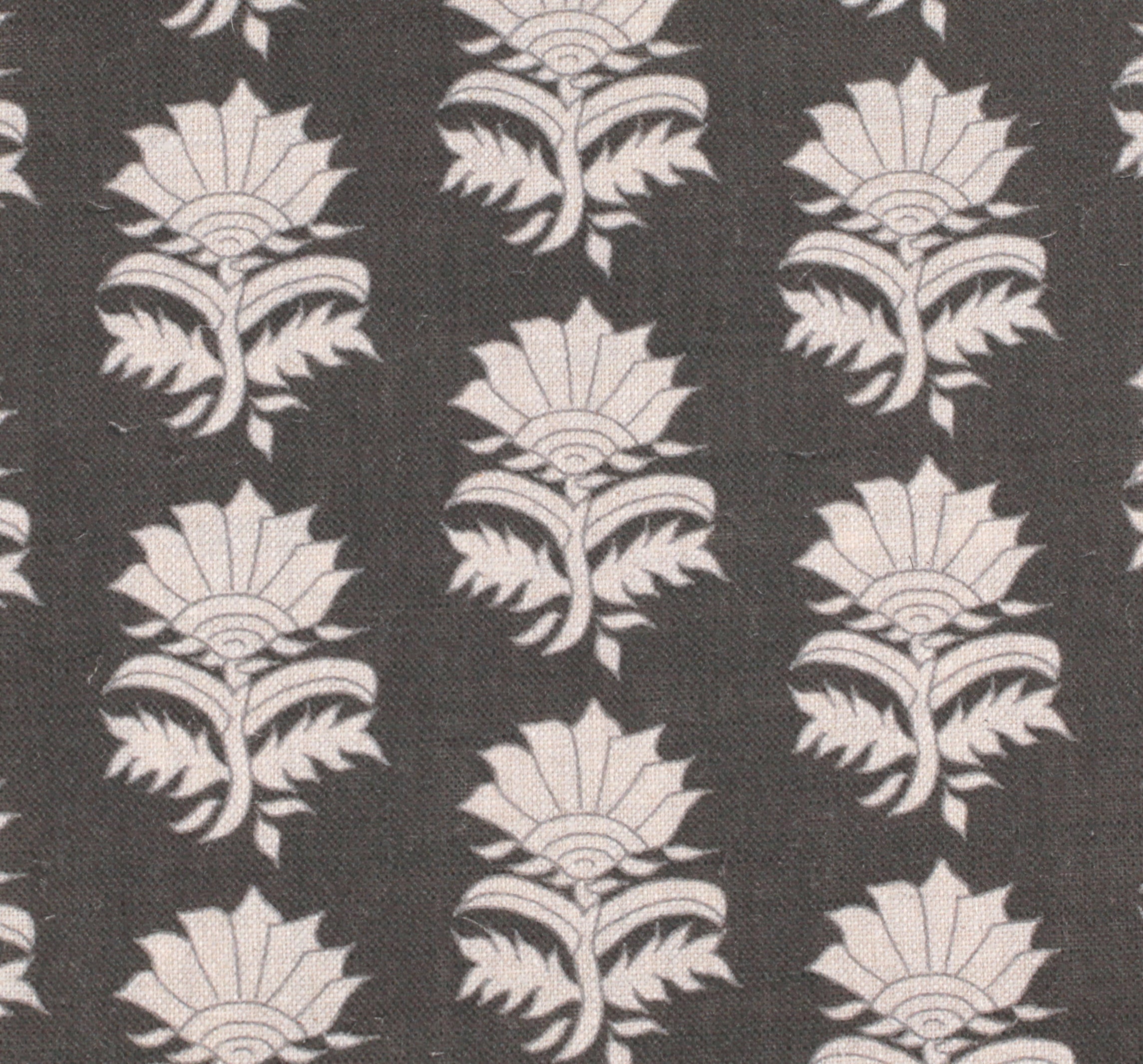Detail of fabric in a repeating thistle print in cream and gray on a charcoal field.