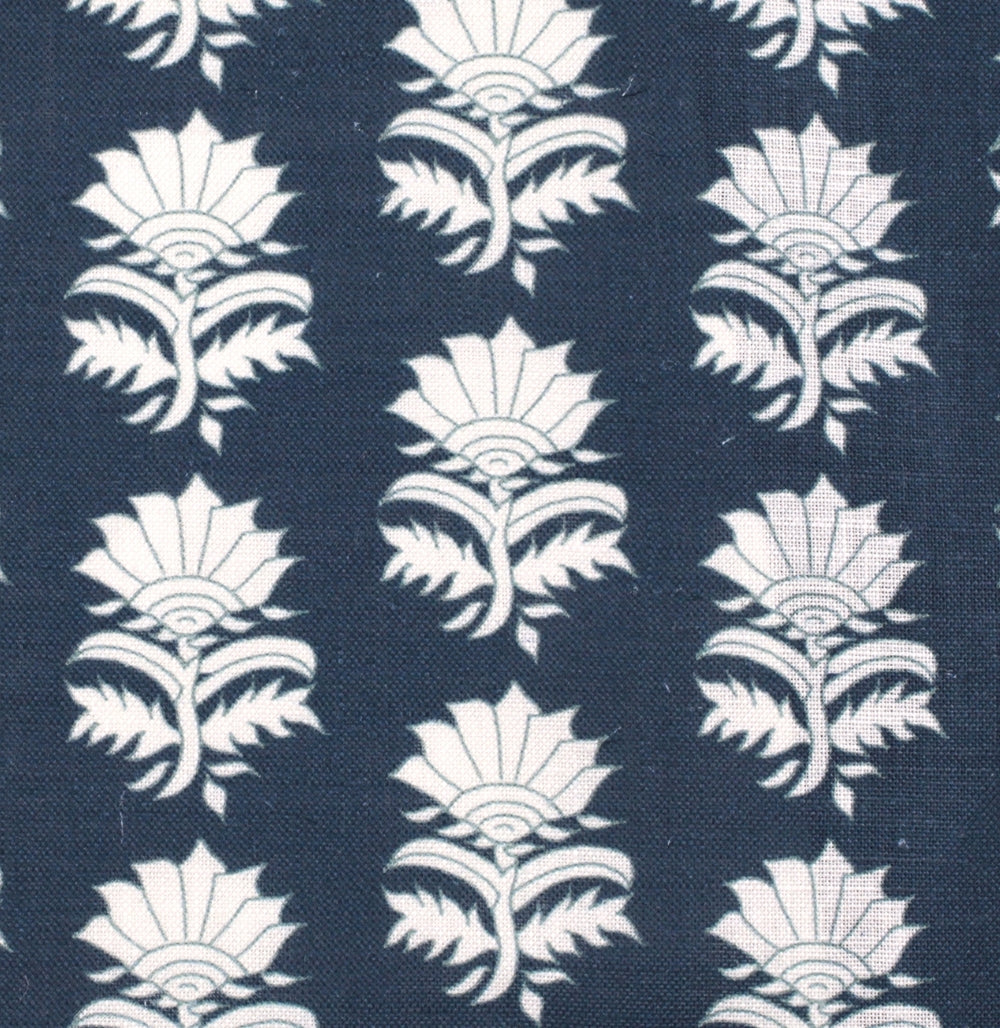 Detail of fabric in a repeating thistle print in white and blue on a navy field.