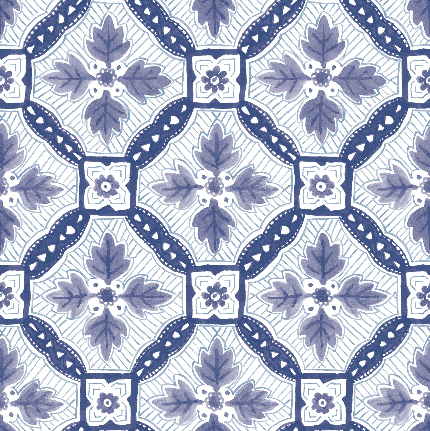 Detail of wallpaper in a painterly botanical grid in shades of navy and purple on a white field.