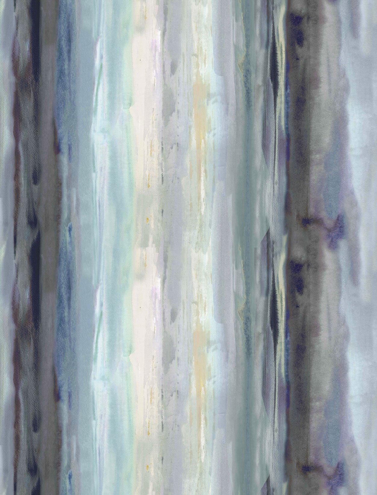 Detail of fabric in an abstract painterly print in shades of gray, blue, green and cream.