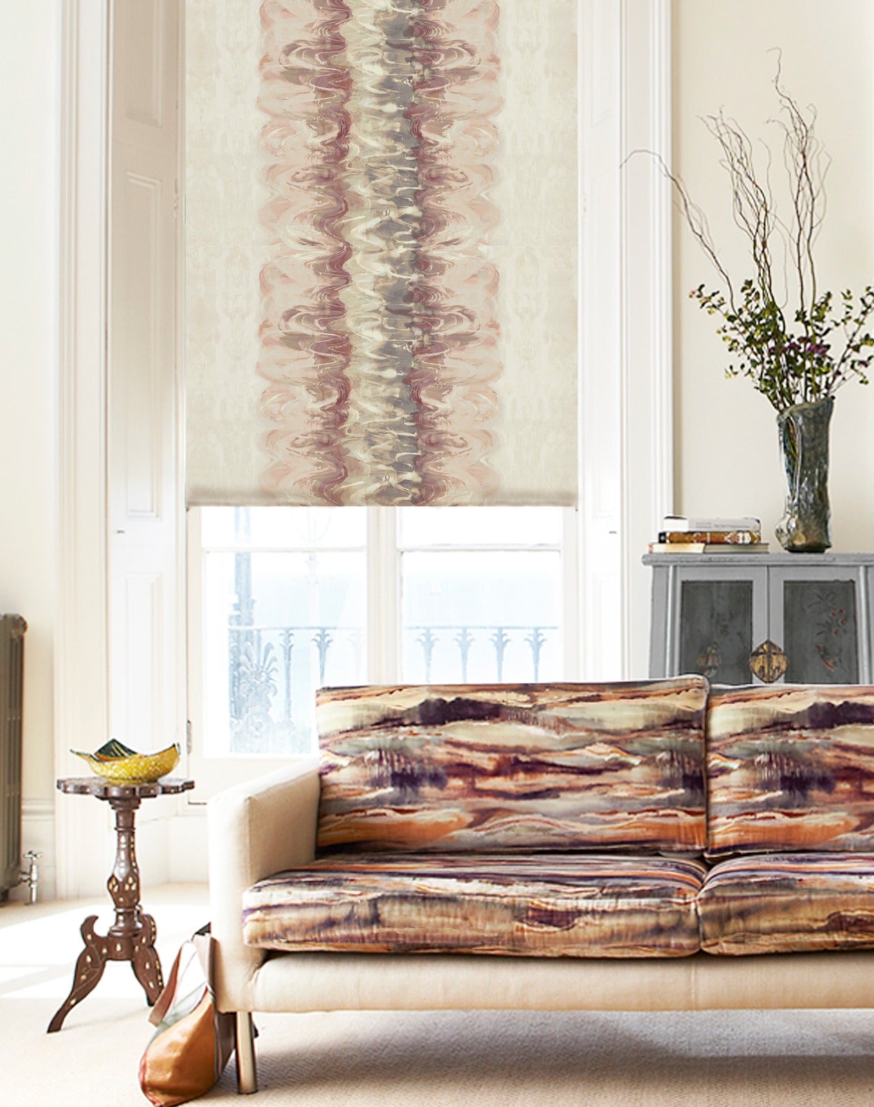 A modernist living space with a sofa and curtains both upholstered in abstract paint blot patterns.
