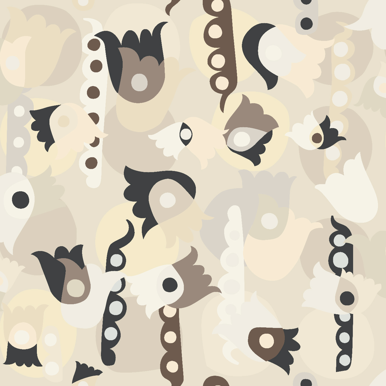 Scaled-out view of wallpaper in a playful modernist floral print in neutral shades on a cream field.