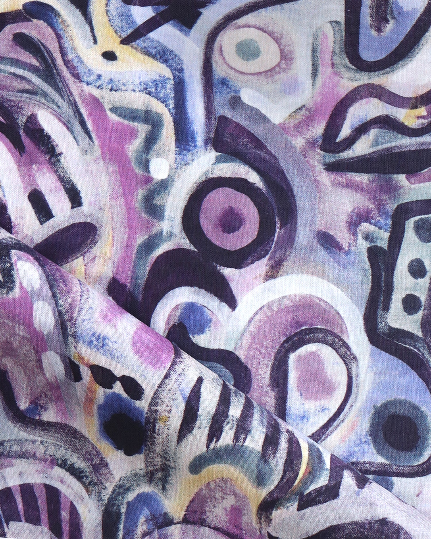 Draped fabric in abstract brushstroke design in shades of purple and black accents.