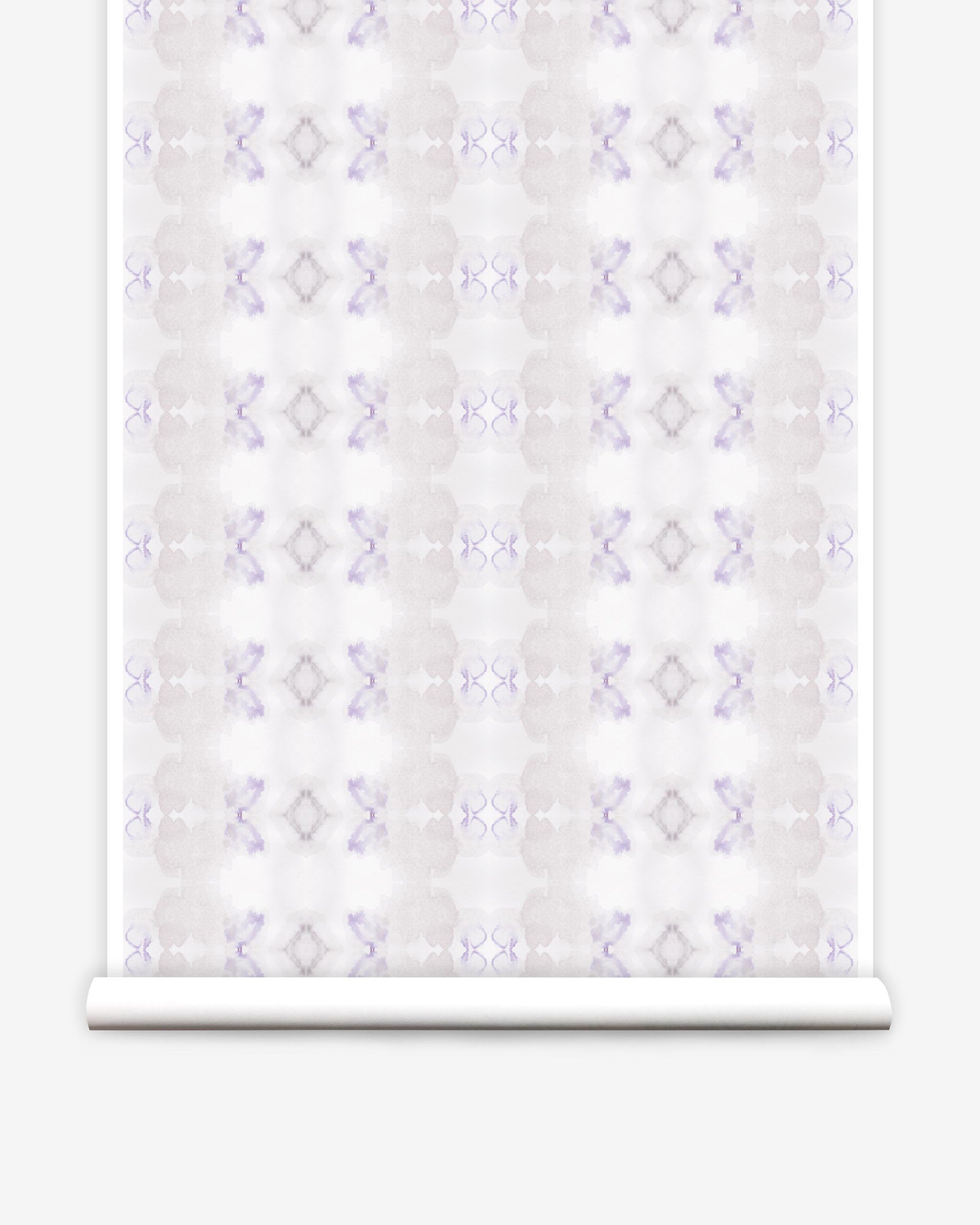 Partially unrolled wallpaper yardage in a striped ink blot print in shades of tan and purple on a cream field.