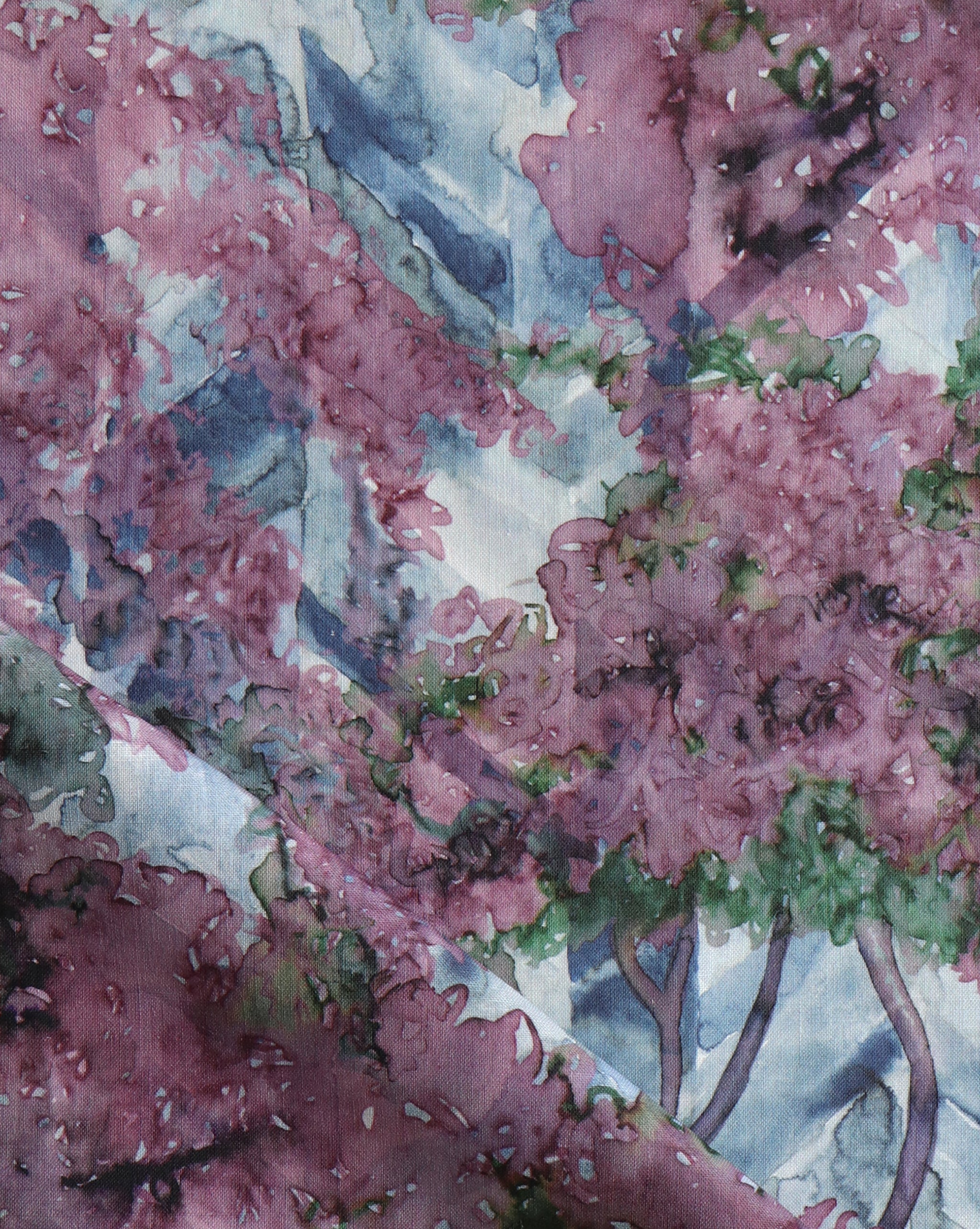 Detail of fabric in a painterly tree print in purple, green and brown.