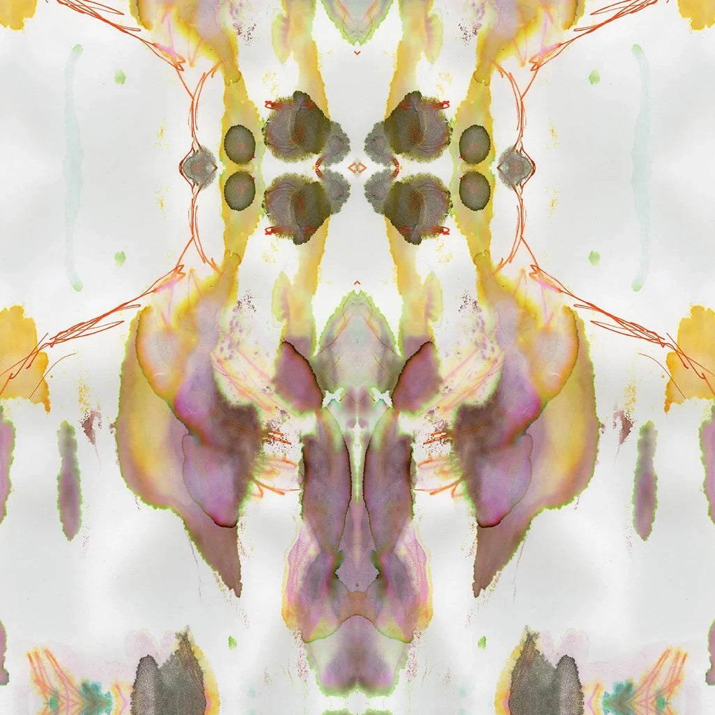 Detail of wallpaper in a watercolor paint blotch print in shades of gray, yellow and pink on a white field.