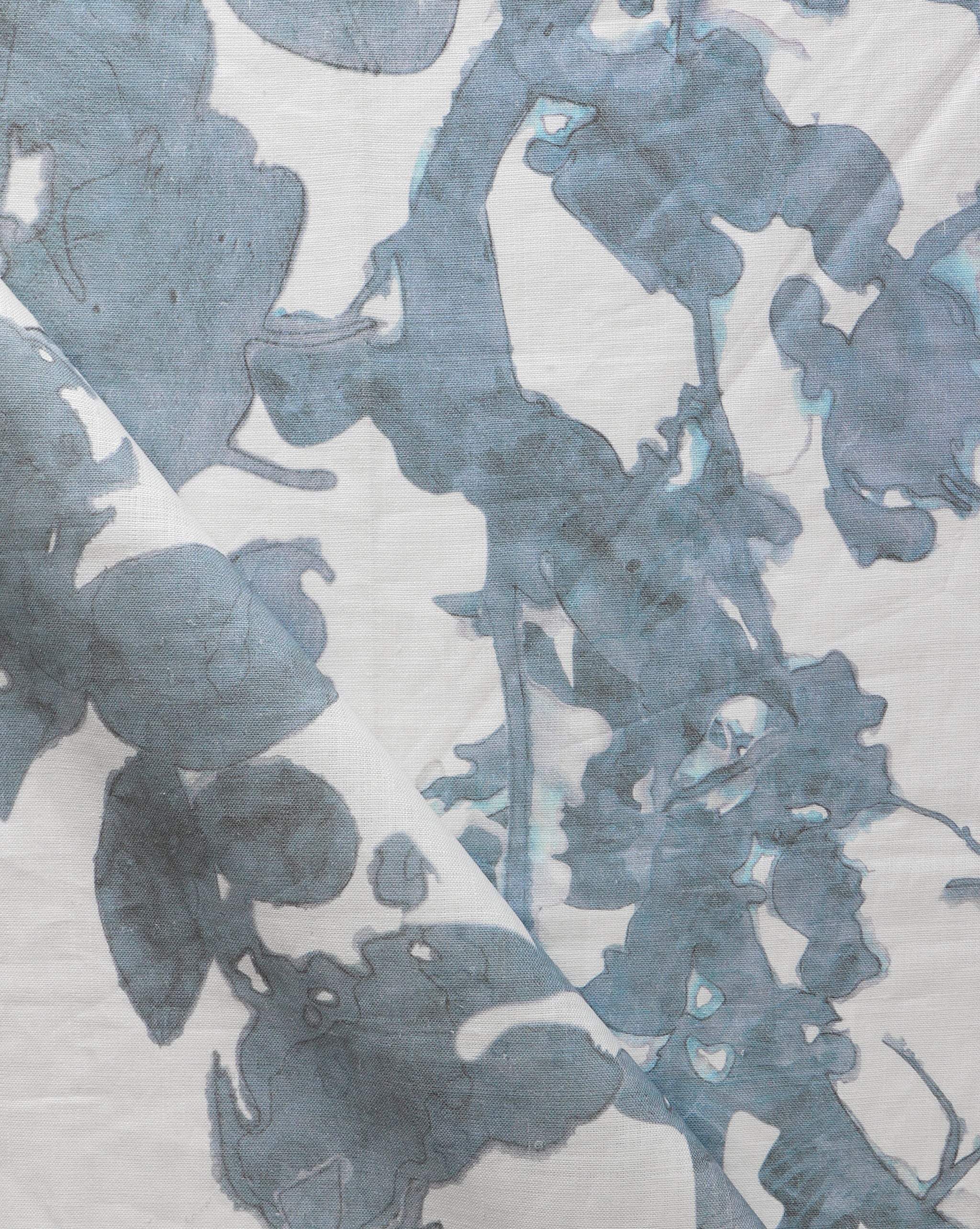 Draped fabric yardage in a watercolor tree print in blue and turquoise on a cream field.