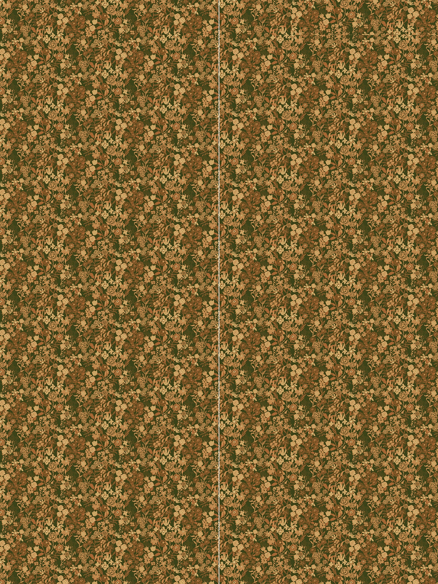 Wallpaper panels in a dense small-scale floral print in shades of brown and tan on a green field.