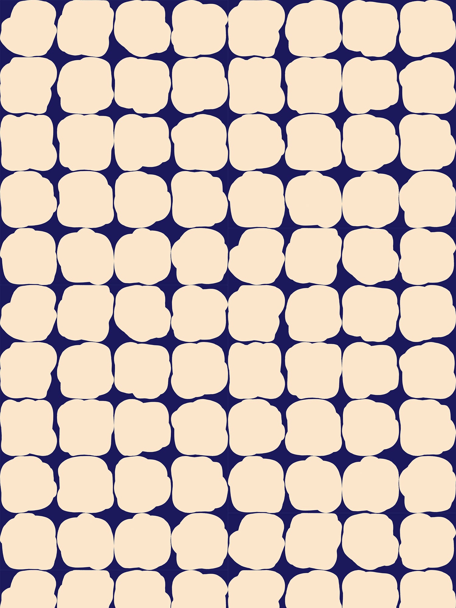 Detail of wallpaper in a repeating blot print in cream on a dark blue field.