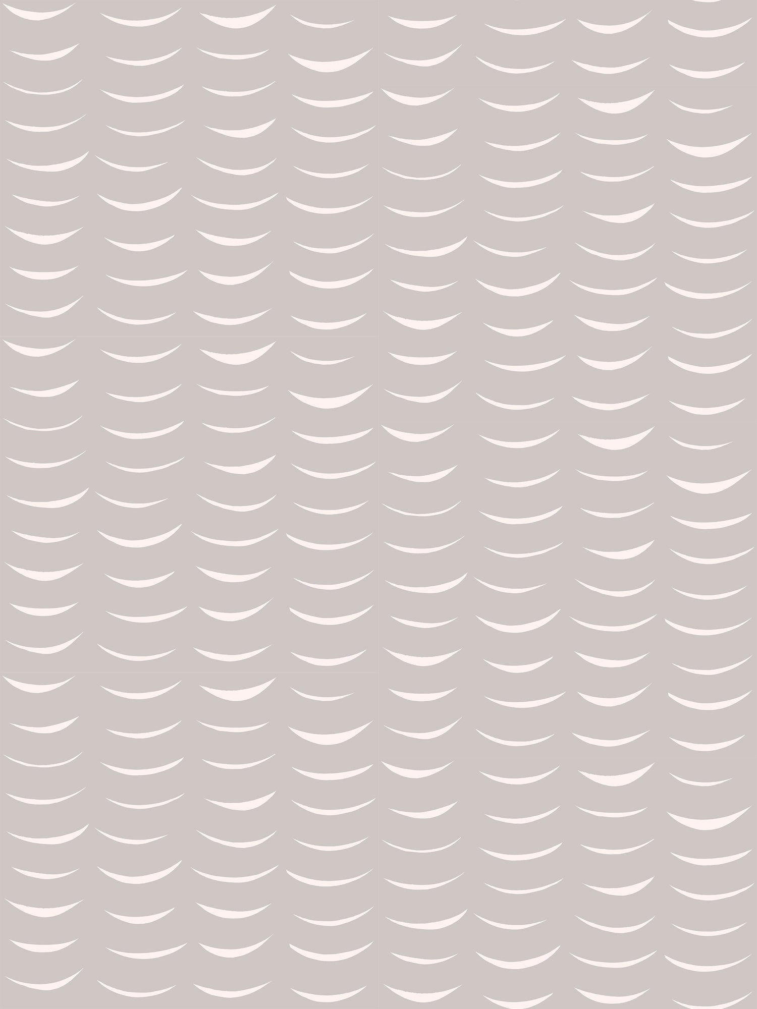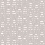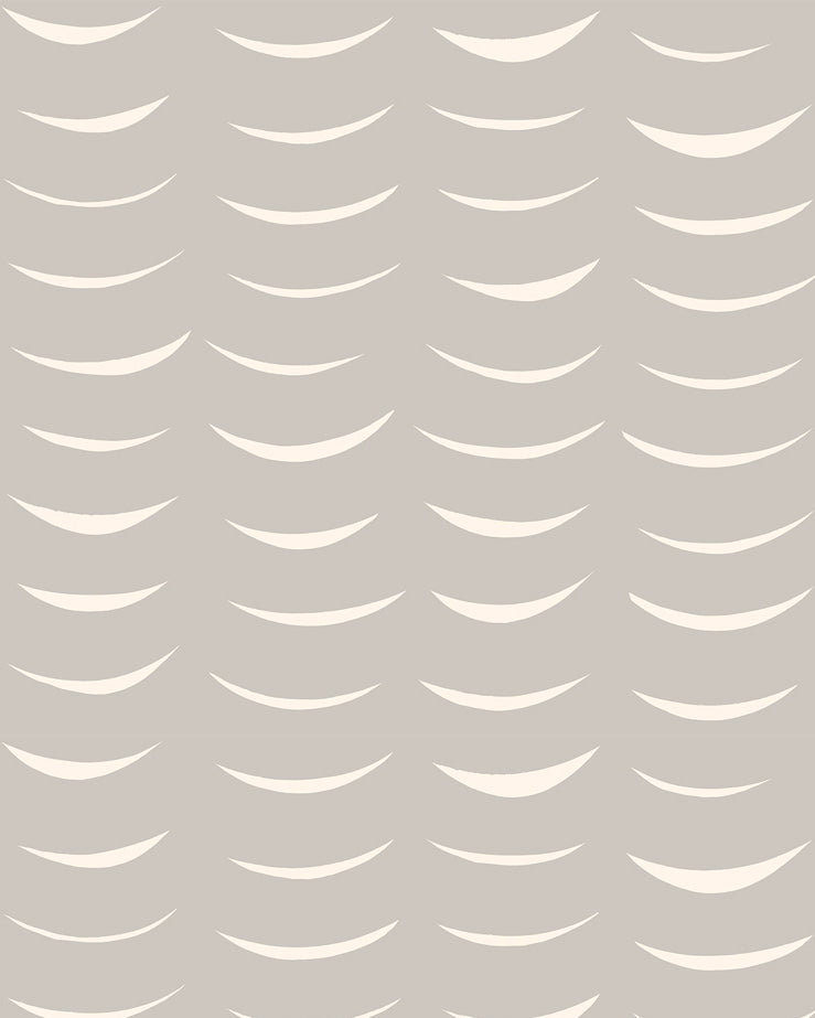 Detail of wallpaper in an abstract crescent print in cream on a gray field.