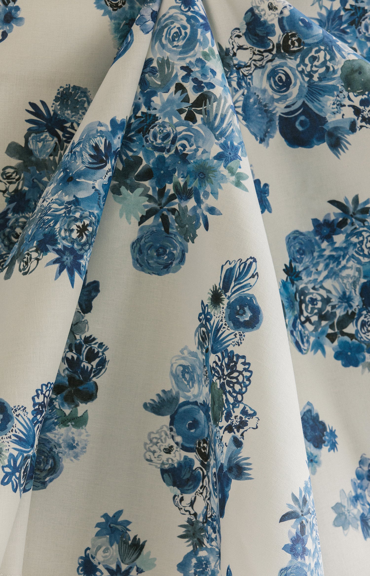 Draped fabric yardage in a painterly floral print in shades of blue and navy on a cream field.