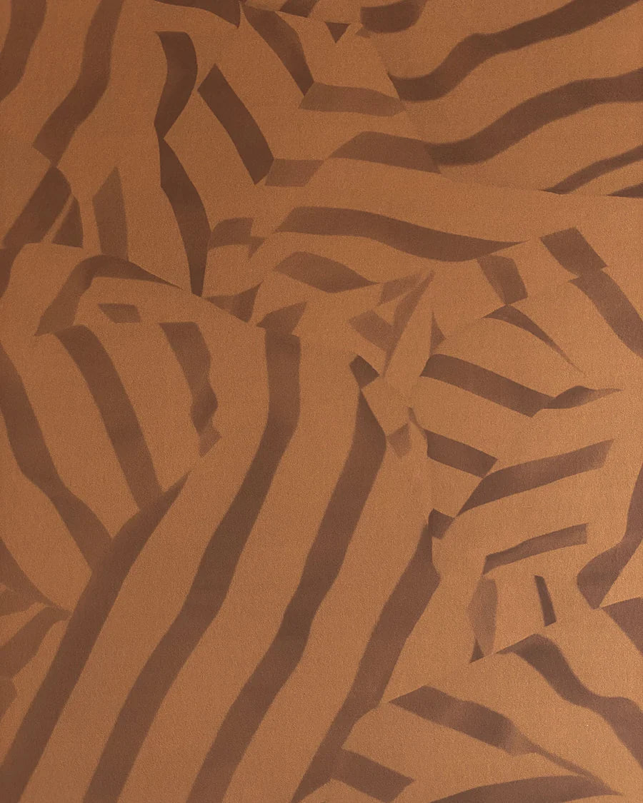 Detail of wallpaper in a playful broken stripe print in dark brown on a brown field.