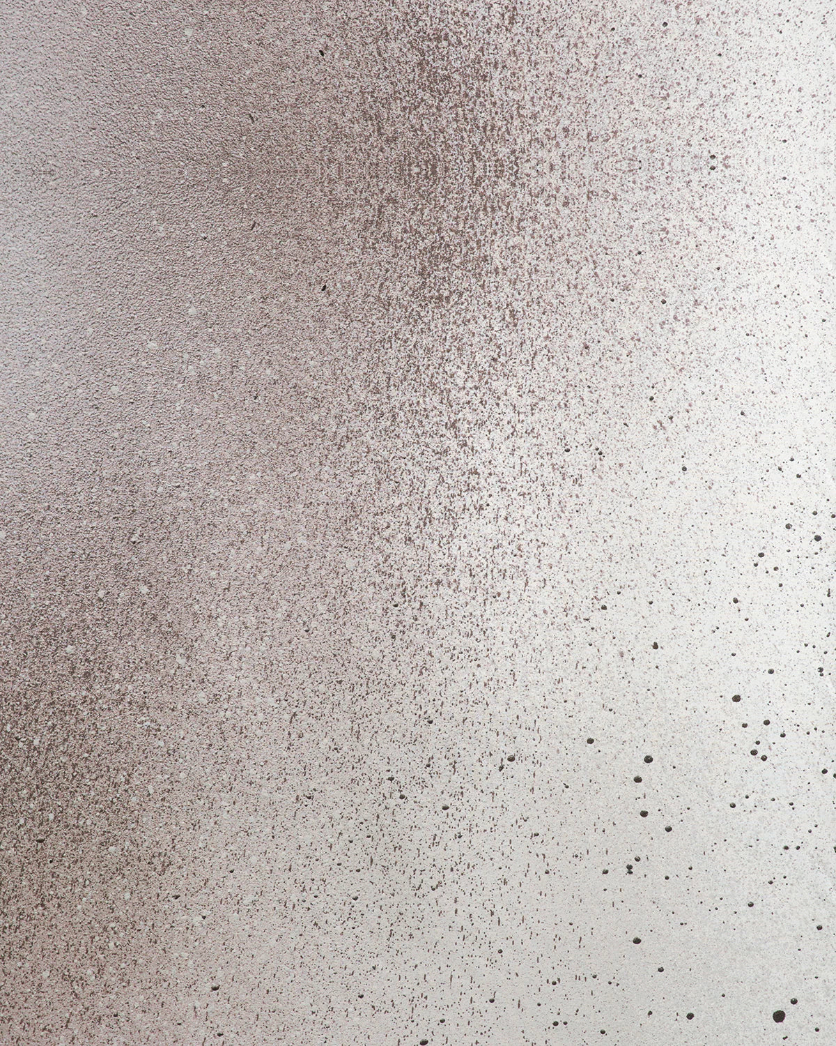 Detail of fabric in an abstract ombré paint splatter print in shades of gray and white.