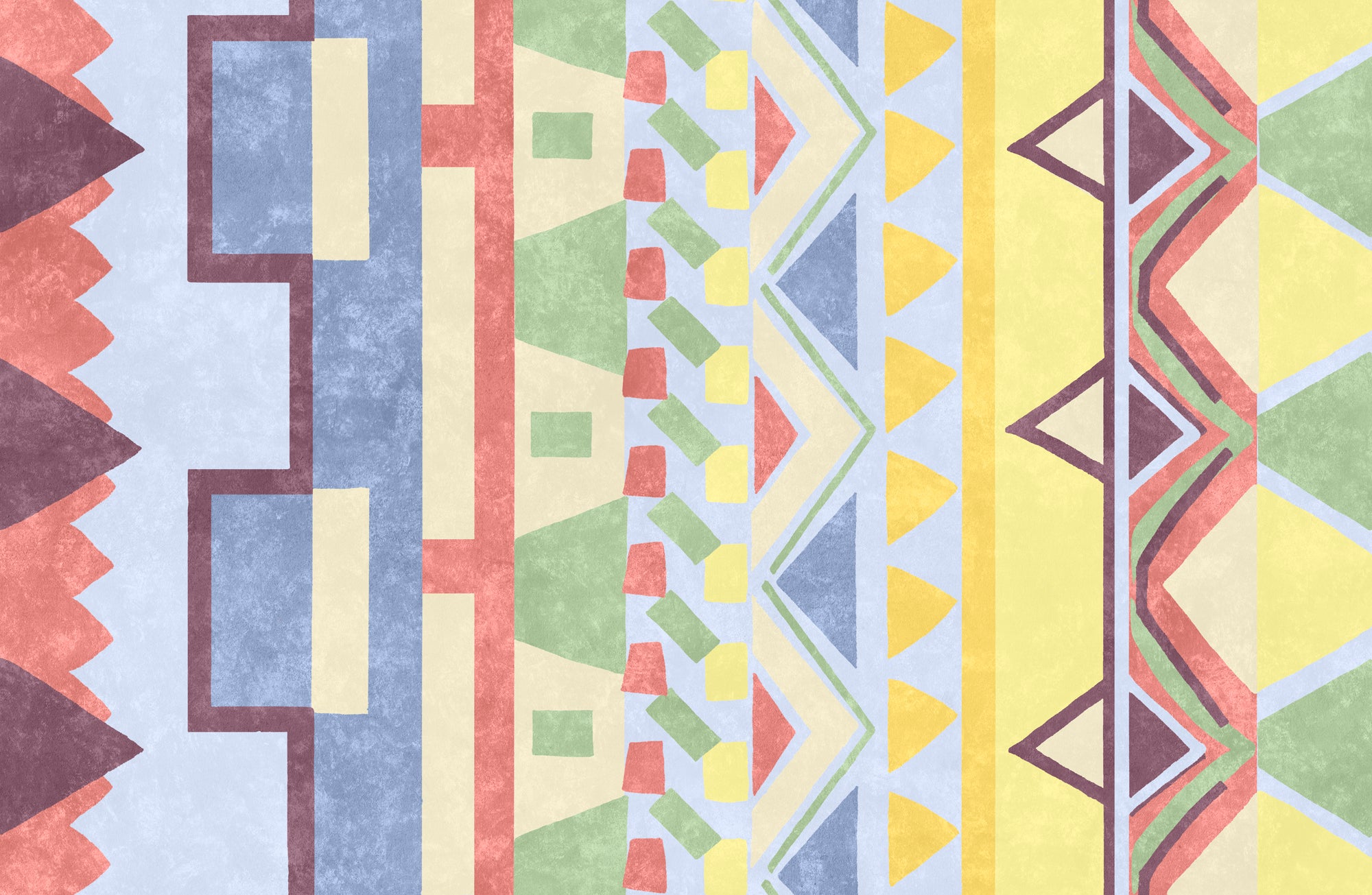 Detail of wallpaper in a playful geometric stripe in a rainbow of pastel shades.