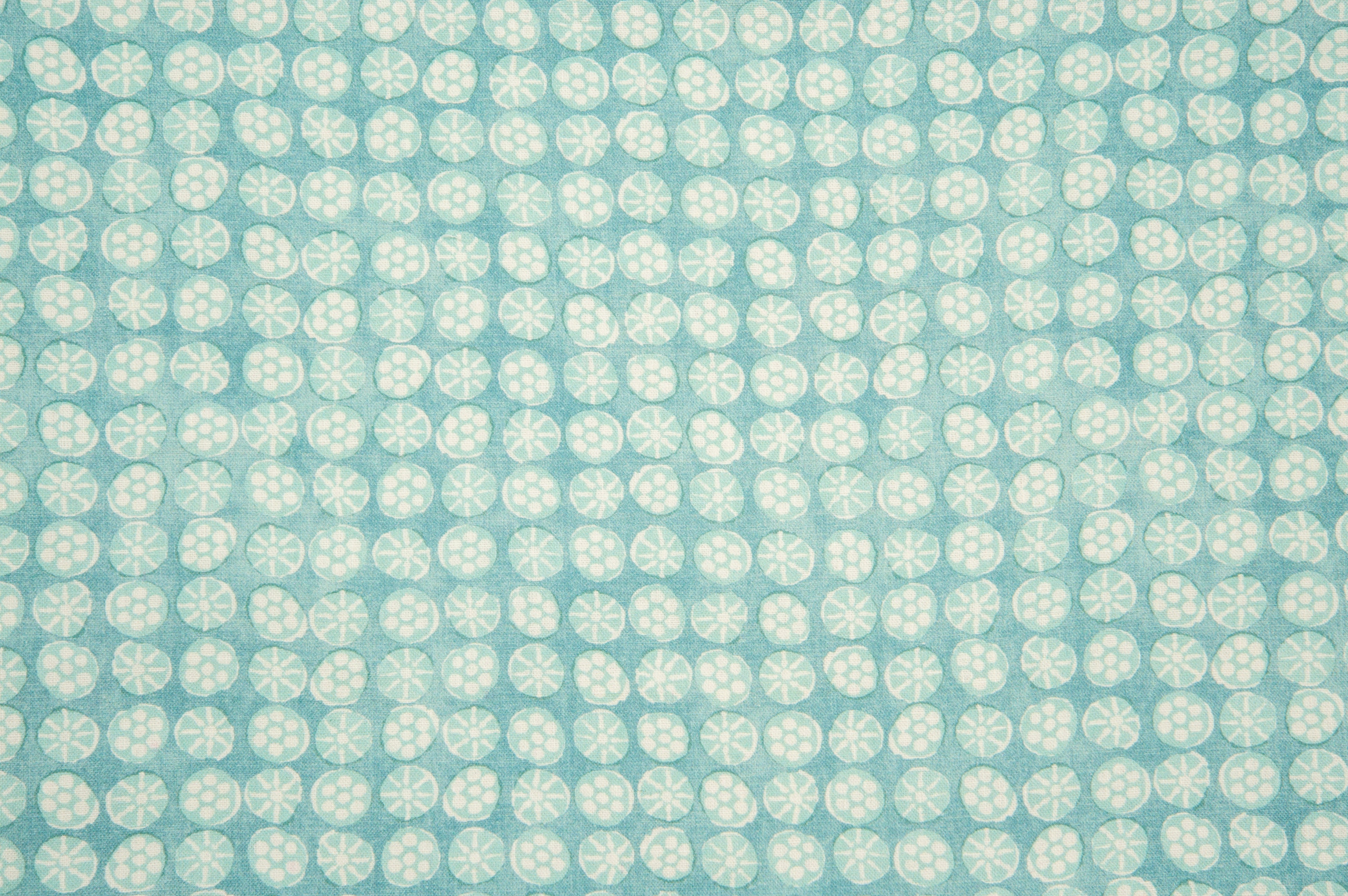 Detail of fabric in a circular floral print in turquoise and white on a blue field.