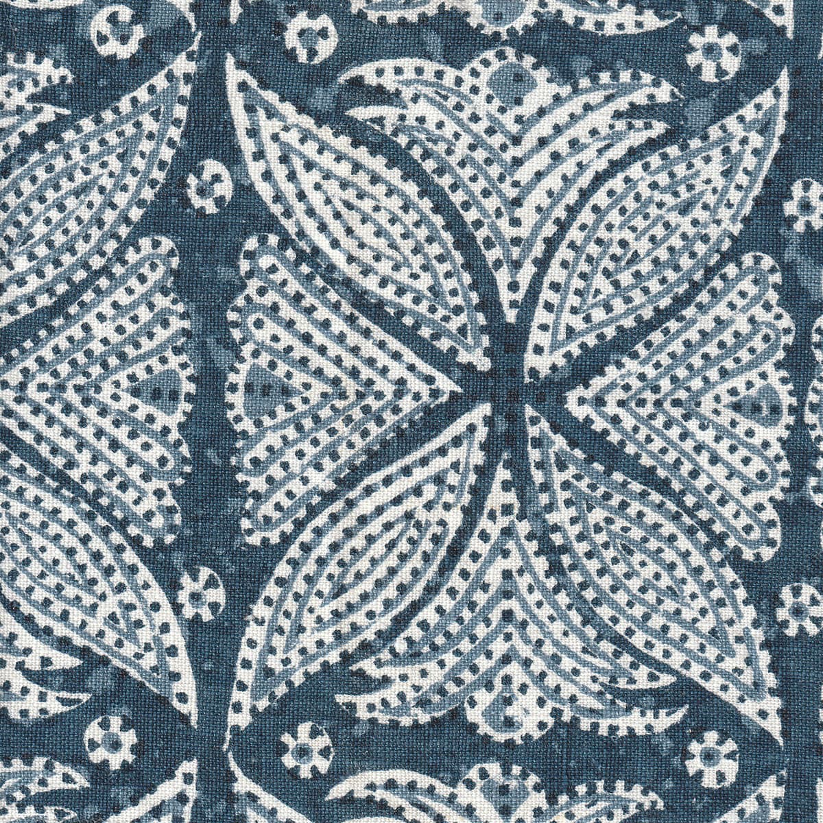 Detail of fabric in a botanical geometric print in shades of blue and white with a navy dot overlay.