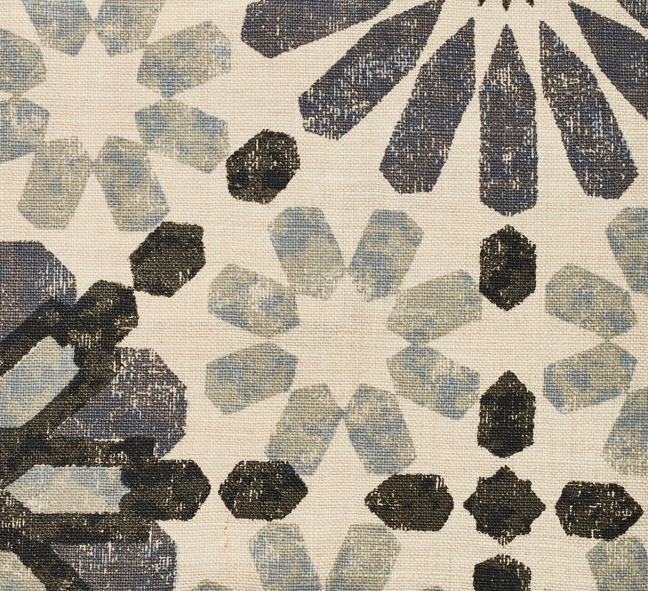 Detail of fabric in a geometric lattice print in shades of black, blue and gray on a cream field.