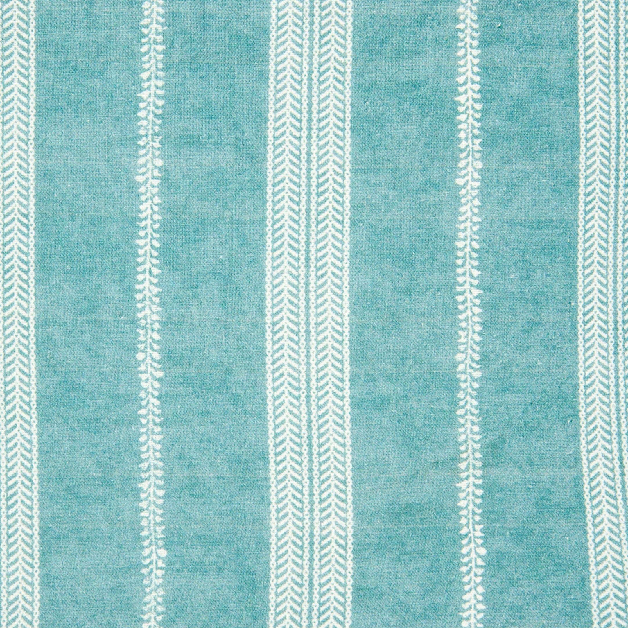 Detail of fabric in a small-scale botanical stripe print in white on a teal field.