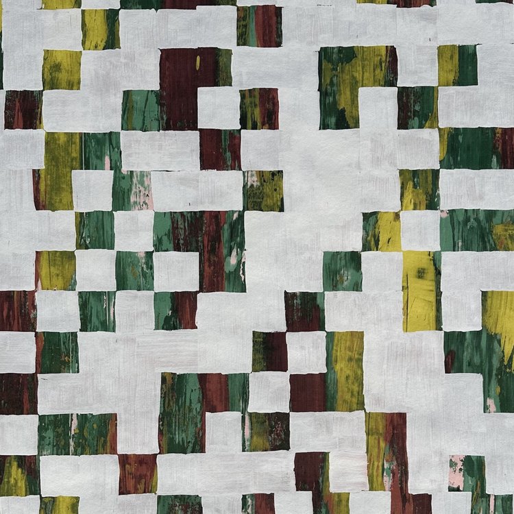 Detail of wallpaper in an abstract check print in mottled green, yellow and red on a white field.