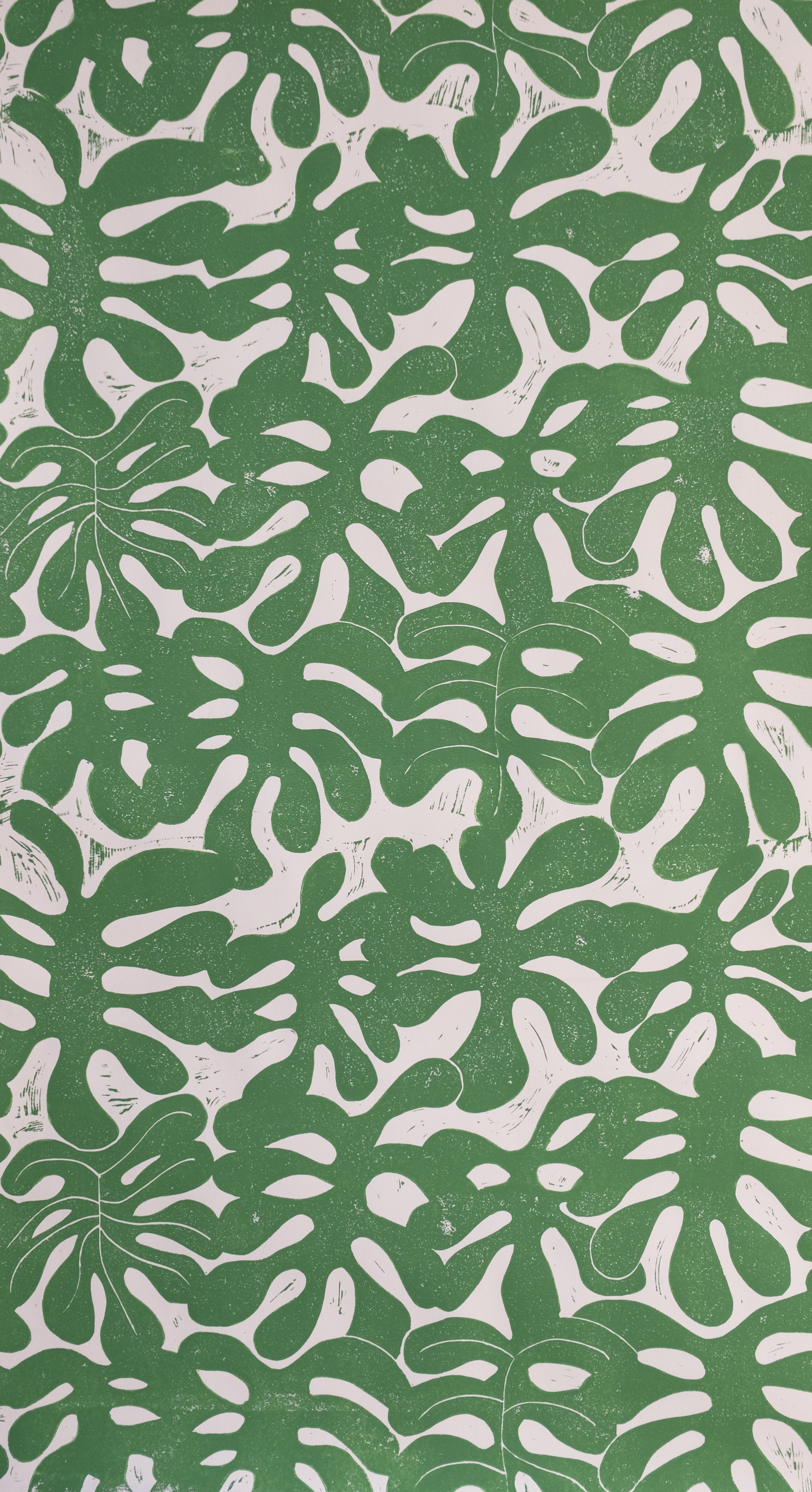 Detail of wallpaper in a playful repeating leaf print in green on a cream field.