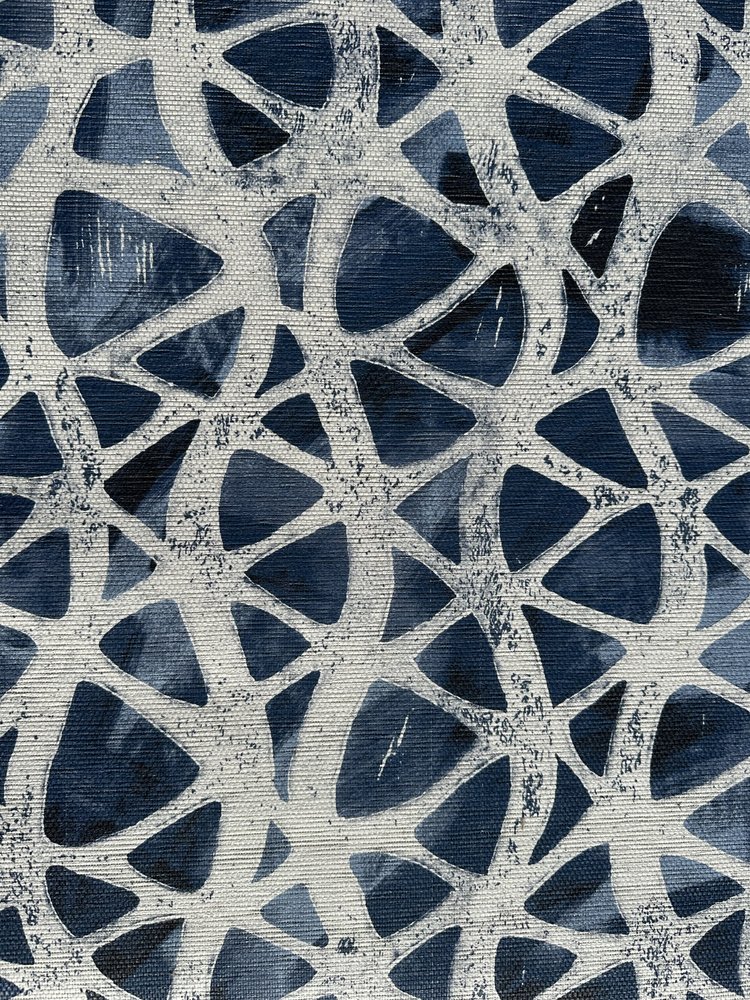 Detail of fabric in an abstract grid print in cream on a mottled navy field.