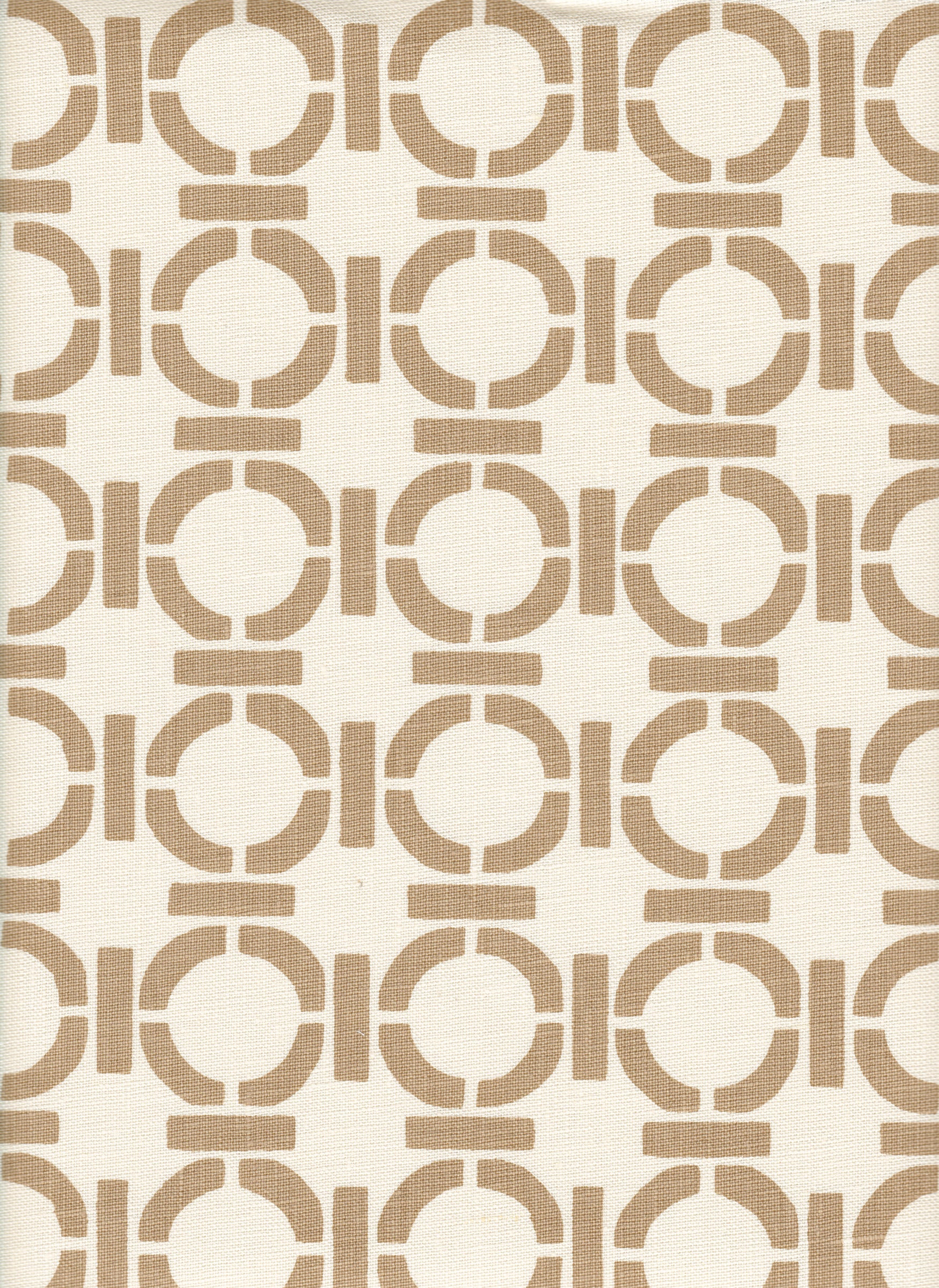 Detail of fabric in a round geometric grid print in light brown on a cream field.