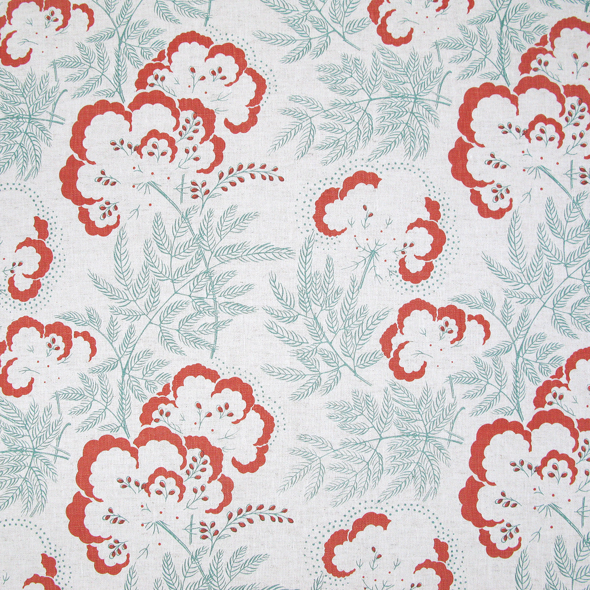 Detail of fabric in an intricate floral print in red and turquoise on a white field.